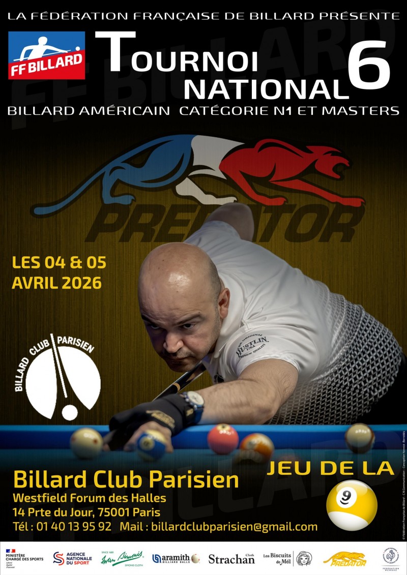 Le 6e et dernier tournoi national au billard américain se déroulera les 4 et 5 avril 2026 au Billard Club Parisien. Les catégories N1 et Masters s'affronteront au jeu de la 9, rendez-vous au Westfield Forum des Halles à Paris pour assister au spectacle.