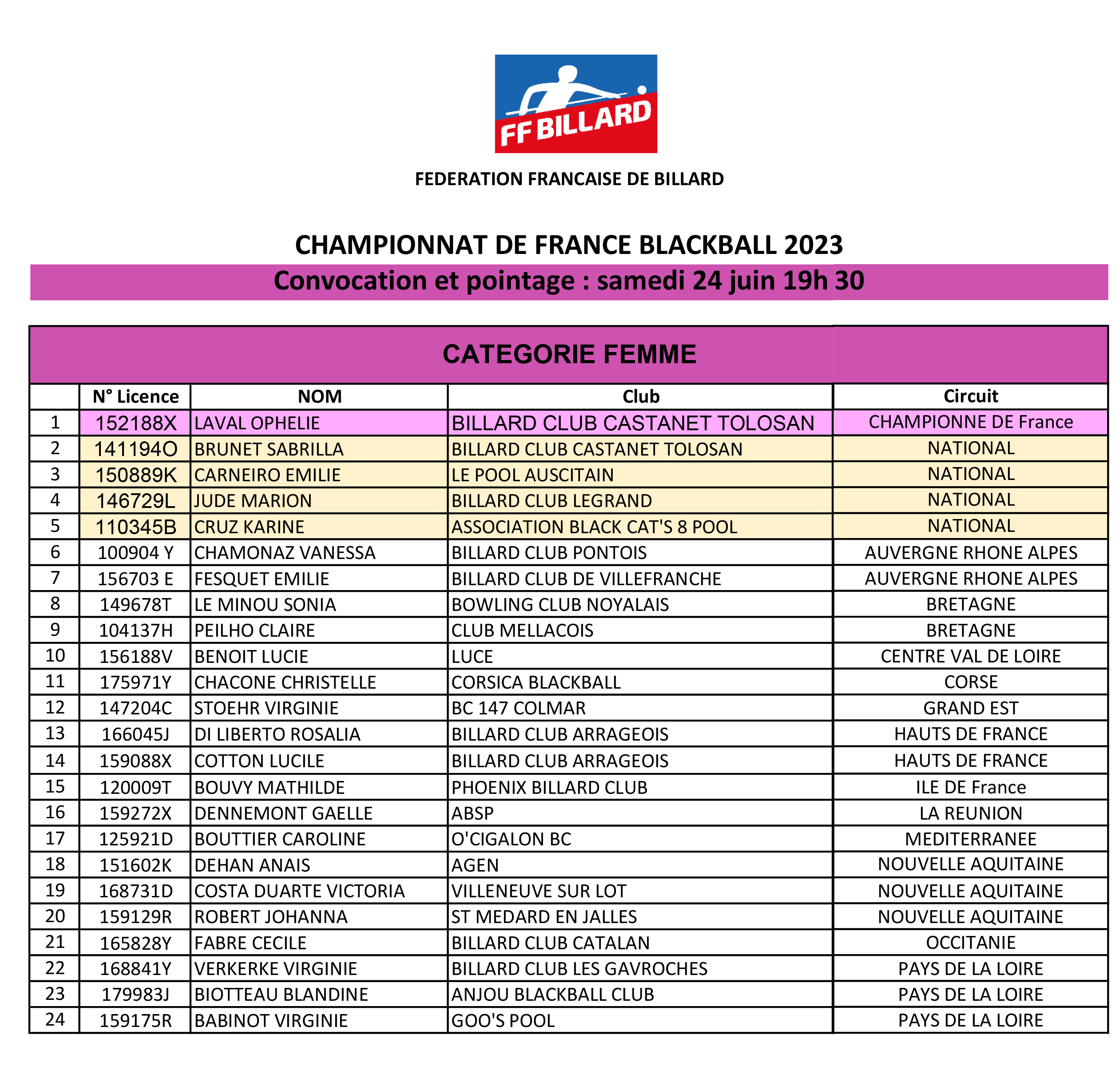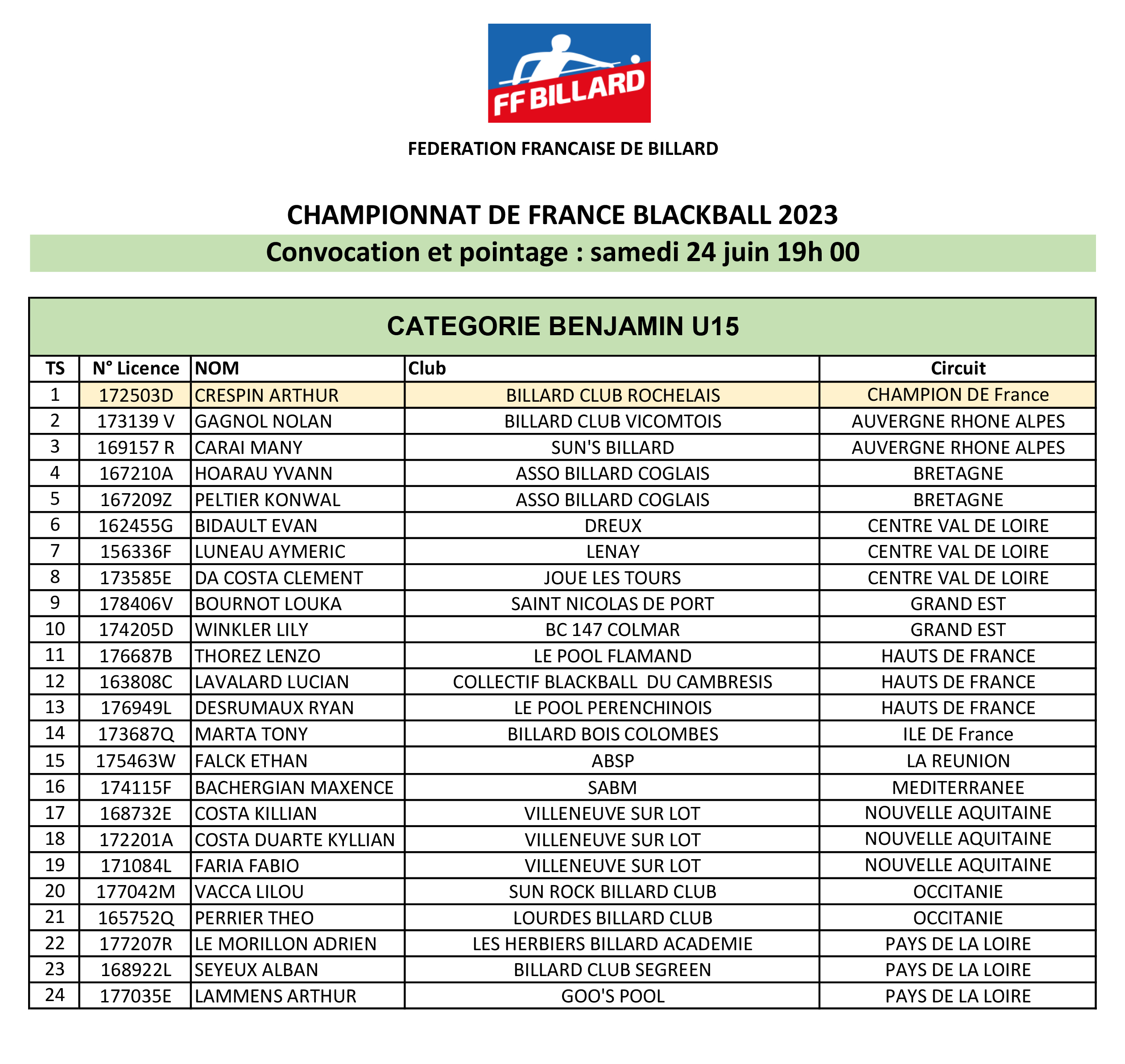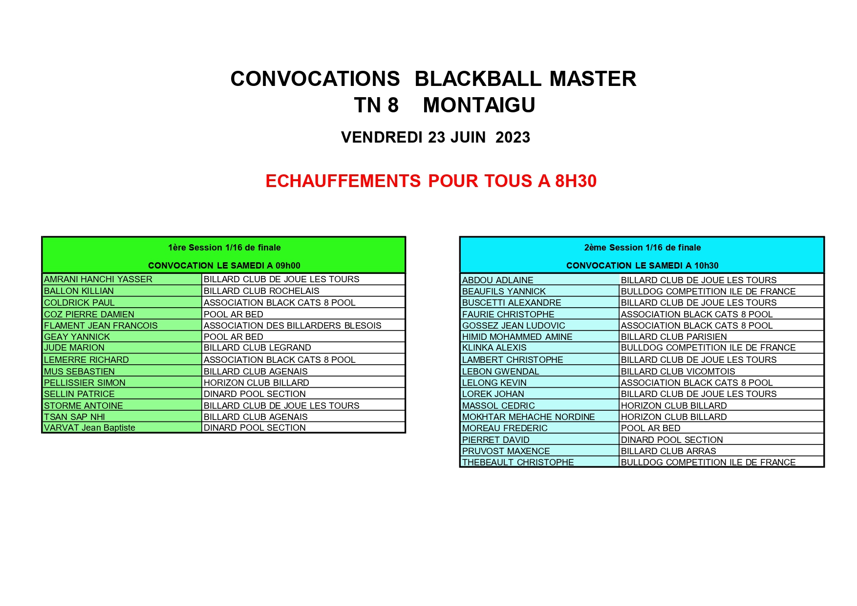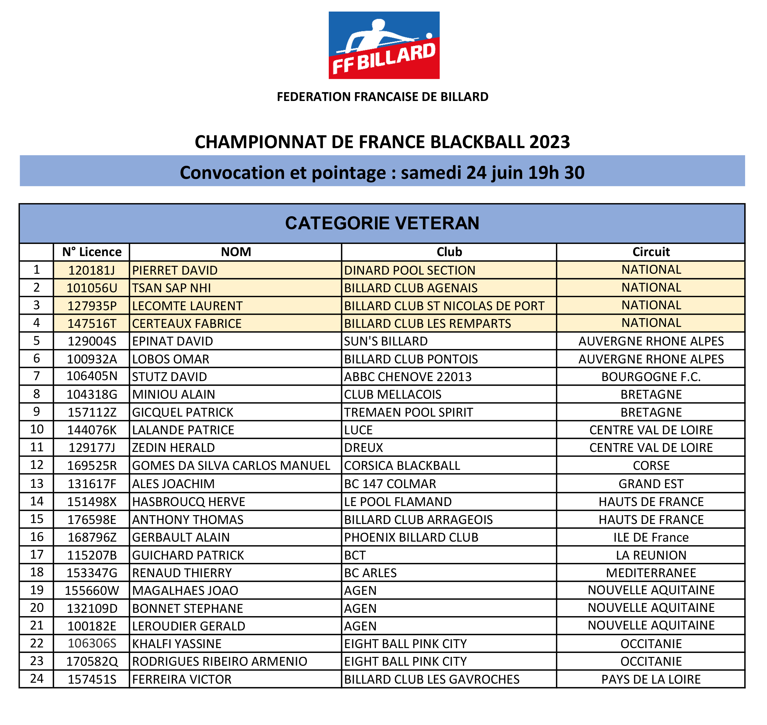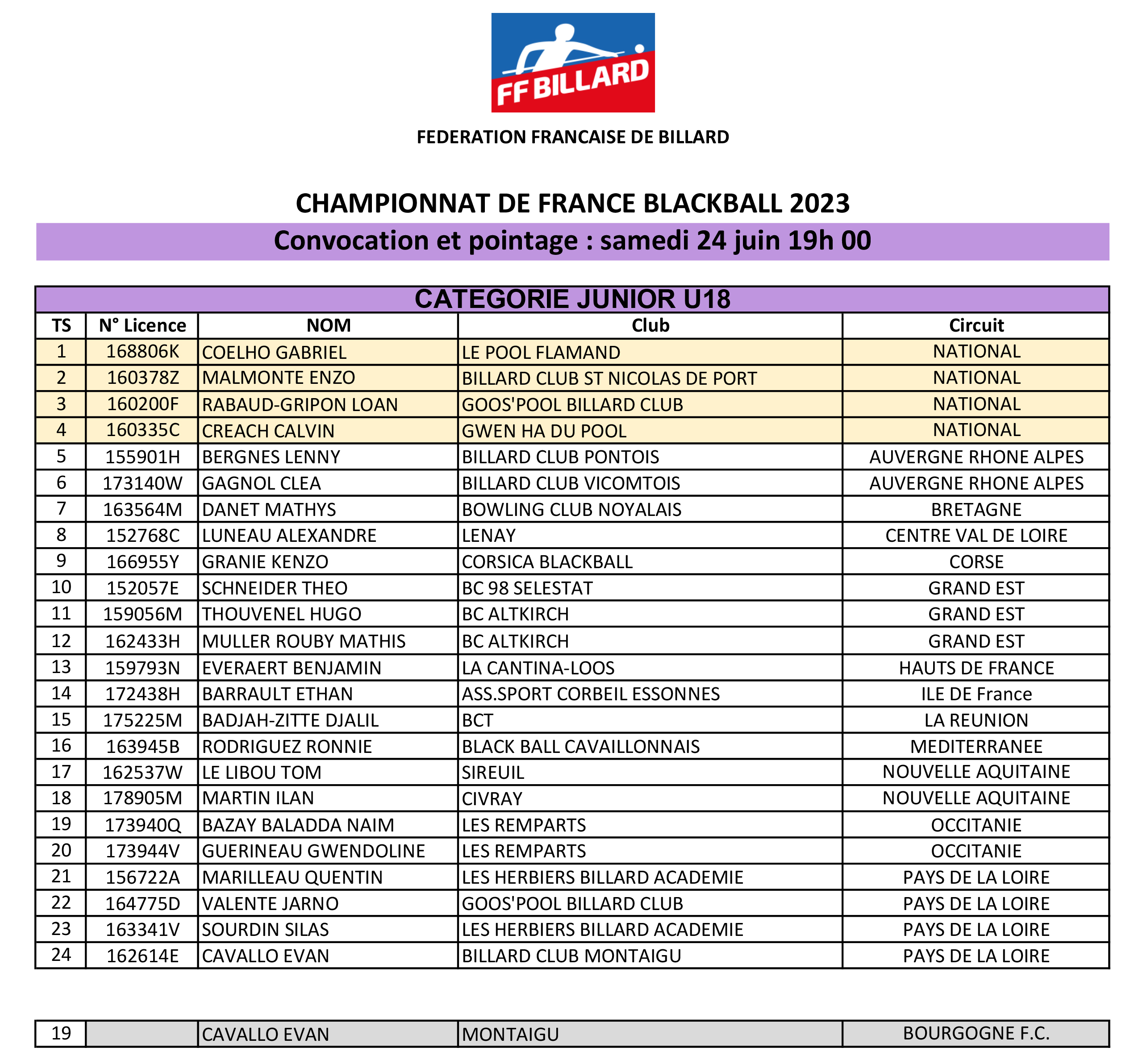 Les convocations pour les championnats de France qui auront lieu du 23 au 25 juin à Montaigu sont disponibles ci-dessous et également accessibles via Compétitions > Blackball > Convocations joueurs.