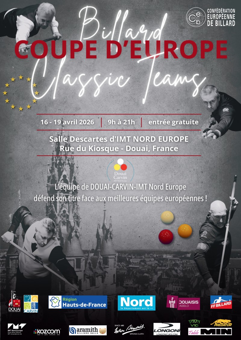 Cette compétition européenne dominée depuis 6 éditions par les clubs français (5x Douarnenez-Valdys, 2018-2024 et 1x Douai-Carvin-IMT Nord Europe, 2025) posera ses valises du 15 au 19 avril à Douai dans le Nord pour du grand spectacle ! Pour assister à une compétition de haut niveau international, où les joueurs s'affronteront dans 3 spécialités du billard français (1 bande, Cadre 47/2 et Cadre 71/2), rendez-vous à la résidence Descartes cette semaine à partir de mercredi !