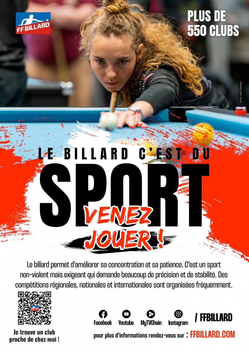 La Fédération française de billard oriente sa communication autour de 3 axes majeurs qui définissent la pratique du billard en club : SPORT / PLAISIR / SANTÉ. Ces thématiques ont pour but de toucher le plus large public possible et de correspondre aux objectifs du projet sportif fédéral.